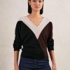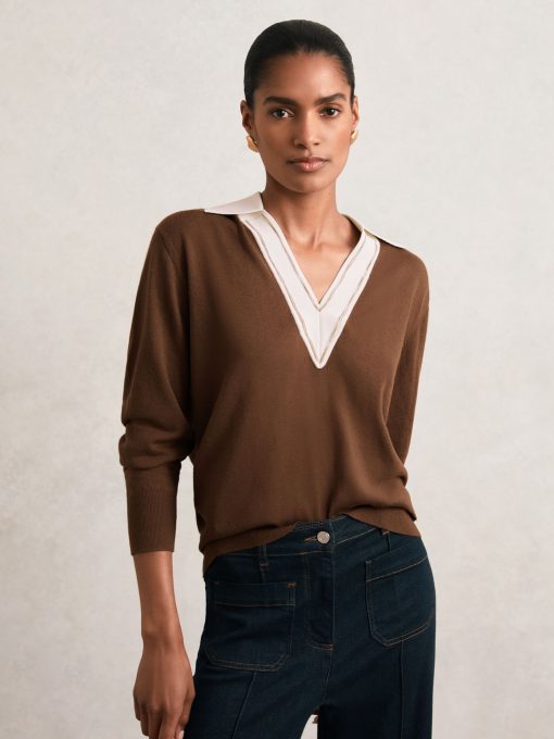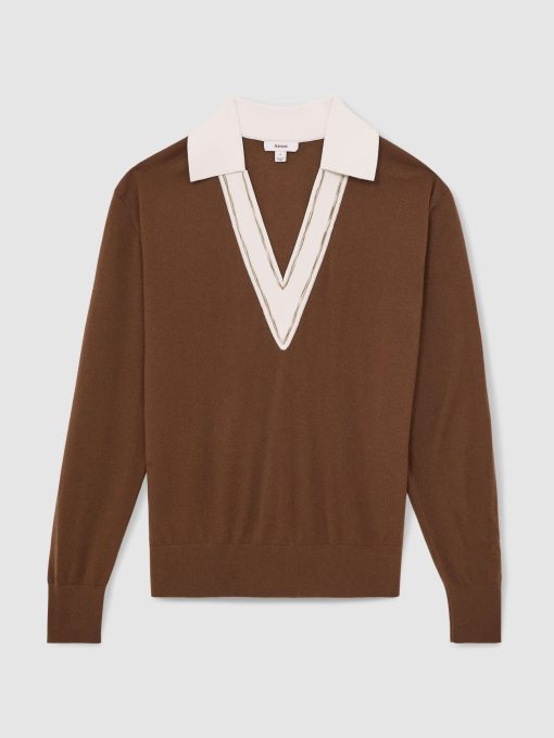 Inspired by classic cricket styles, the Nina jumper is crafted from fine wool with an exquisitely soft hand-feel. A contrasting flat open collar is complemented by a subtly embroidered V neckline. 100% wool Open collar V-neckline with embroidery Ribbed hem and cuffs The model is wearing a size S. Measurements of model: Height 5ft 10″ / 177.8cm.