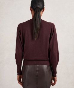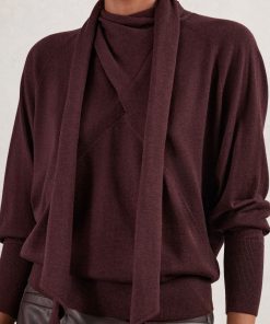 The Burgundy Alexis jumper is crafted from 100% wool with a relaxed silhouette. A softly draped crossover detail defines the front and flows into a high neckline, complemented by a scarf detail that wraps the neck. 100% wool Scarf detail Crossover draping Ribbed hem and cuffs The model is wearing a size S. Measurements of model: Height 5ft 10″ / 177.8cm.